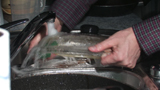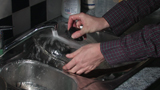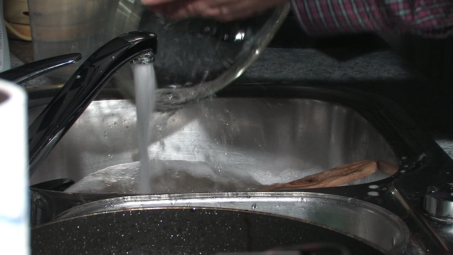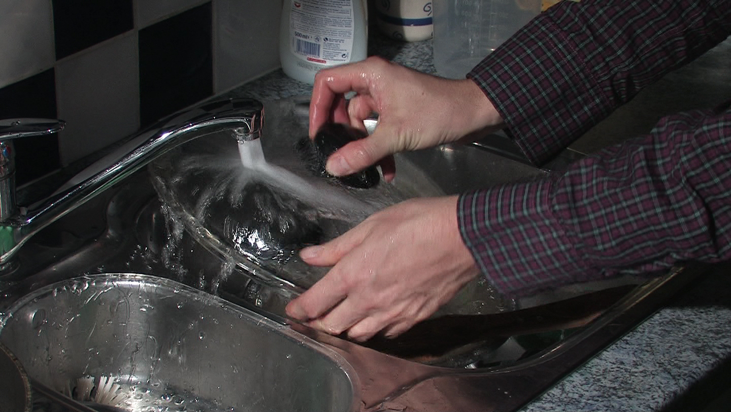 Description: Someone washes pans and pots in the sink.