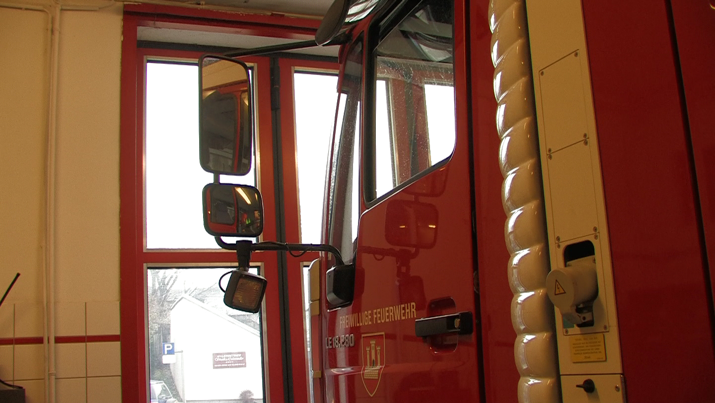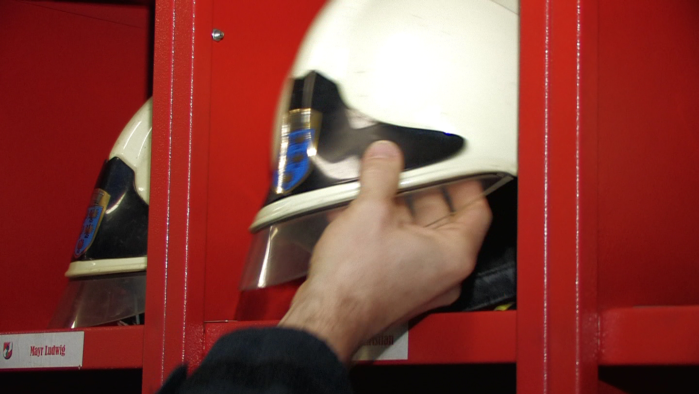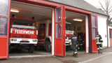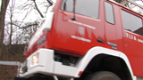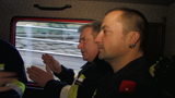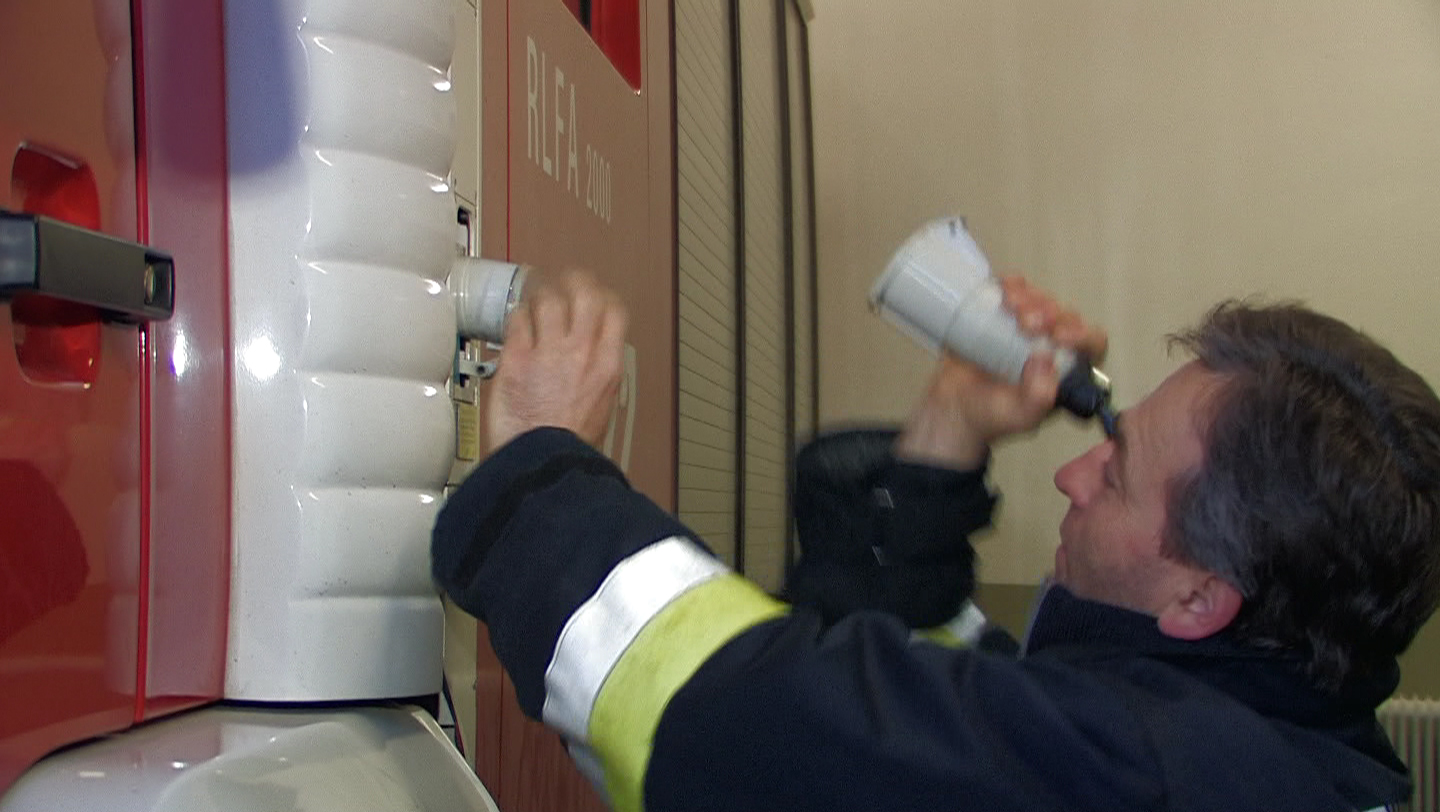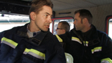 说明: Firemen preparing for a fire brigade operation, putting on their clothes and drivin with a fire engine.