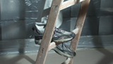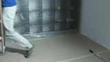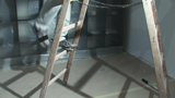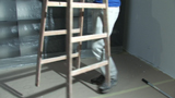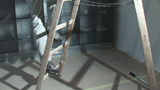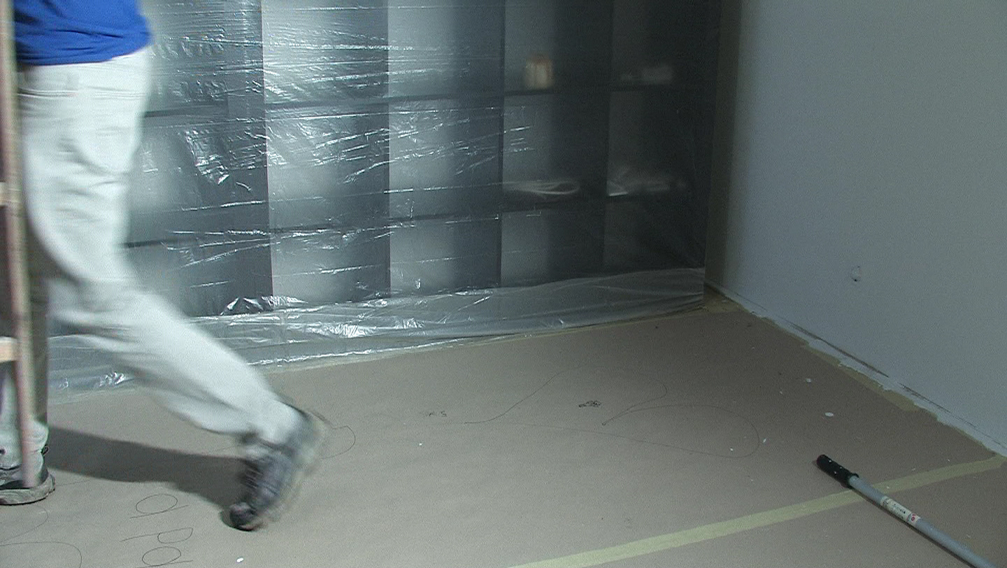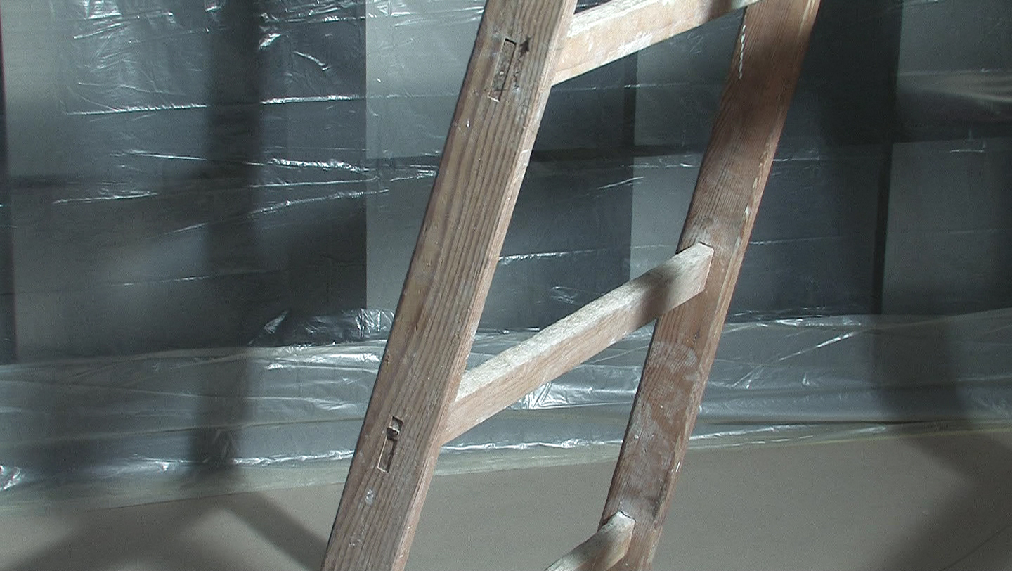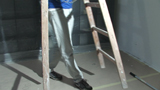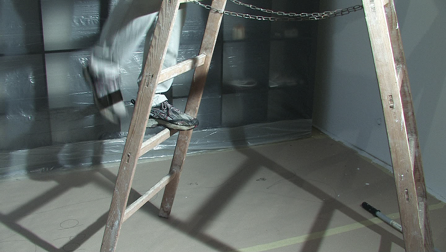 Description: A painter installs a ladder and climbs it up to paint the wall.