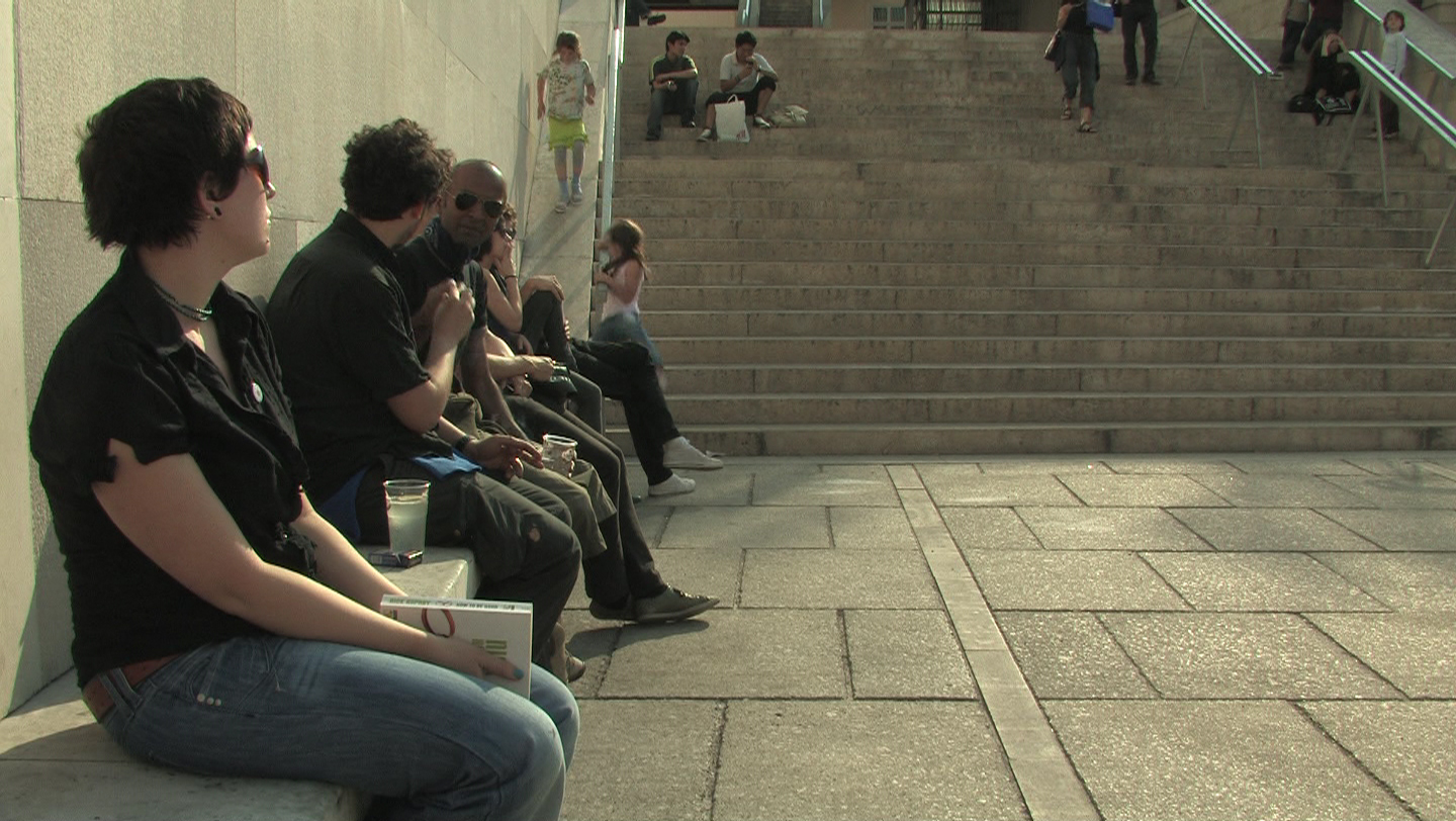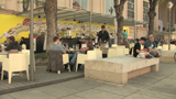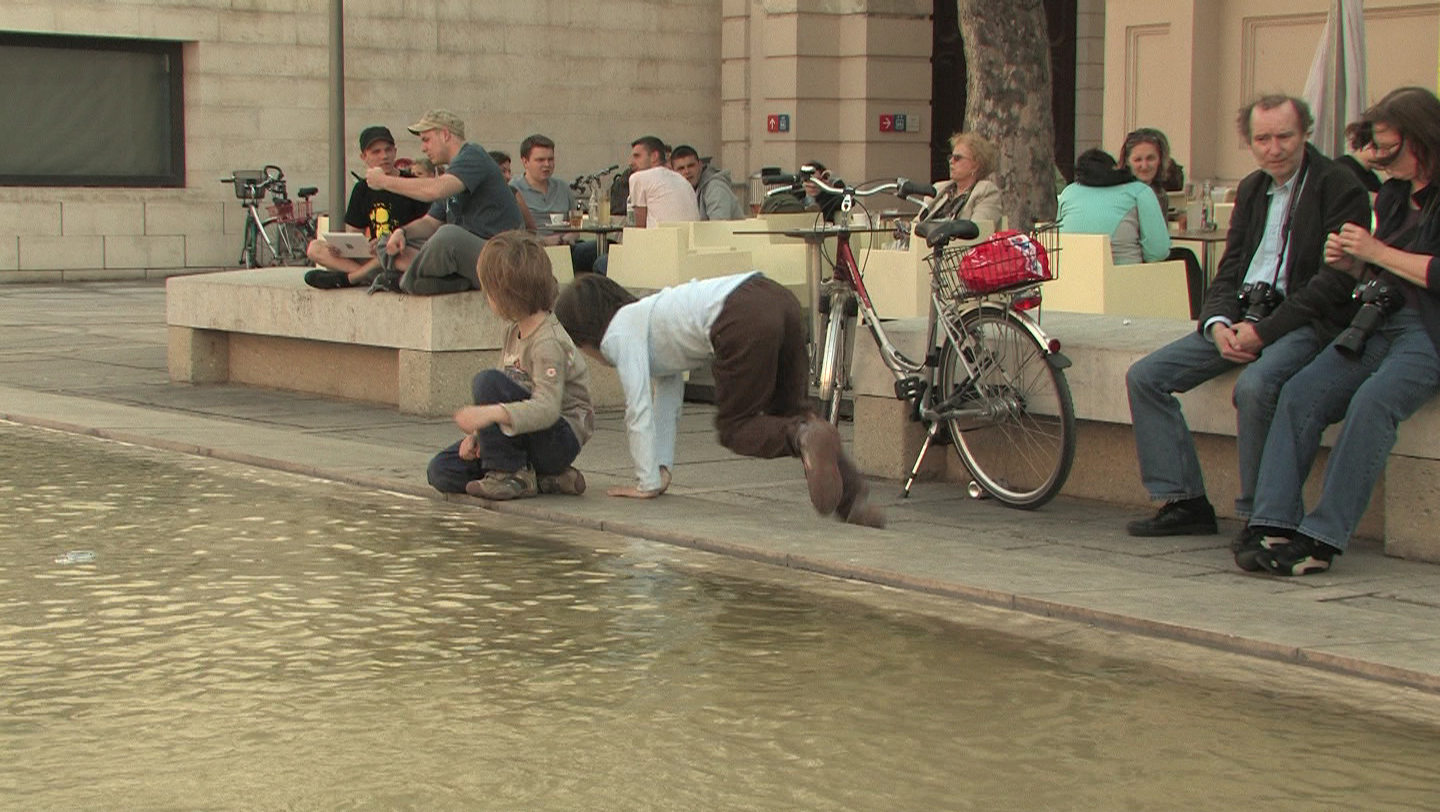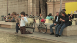 说明: People are sitting on benches, ducks are swimming in a fountain.