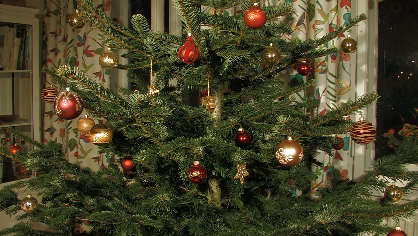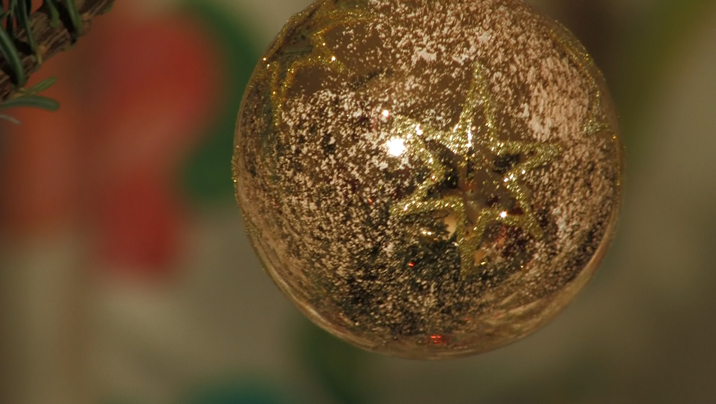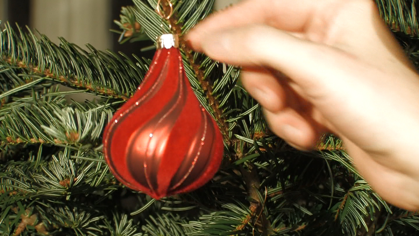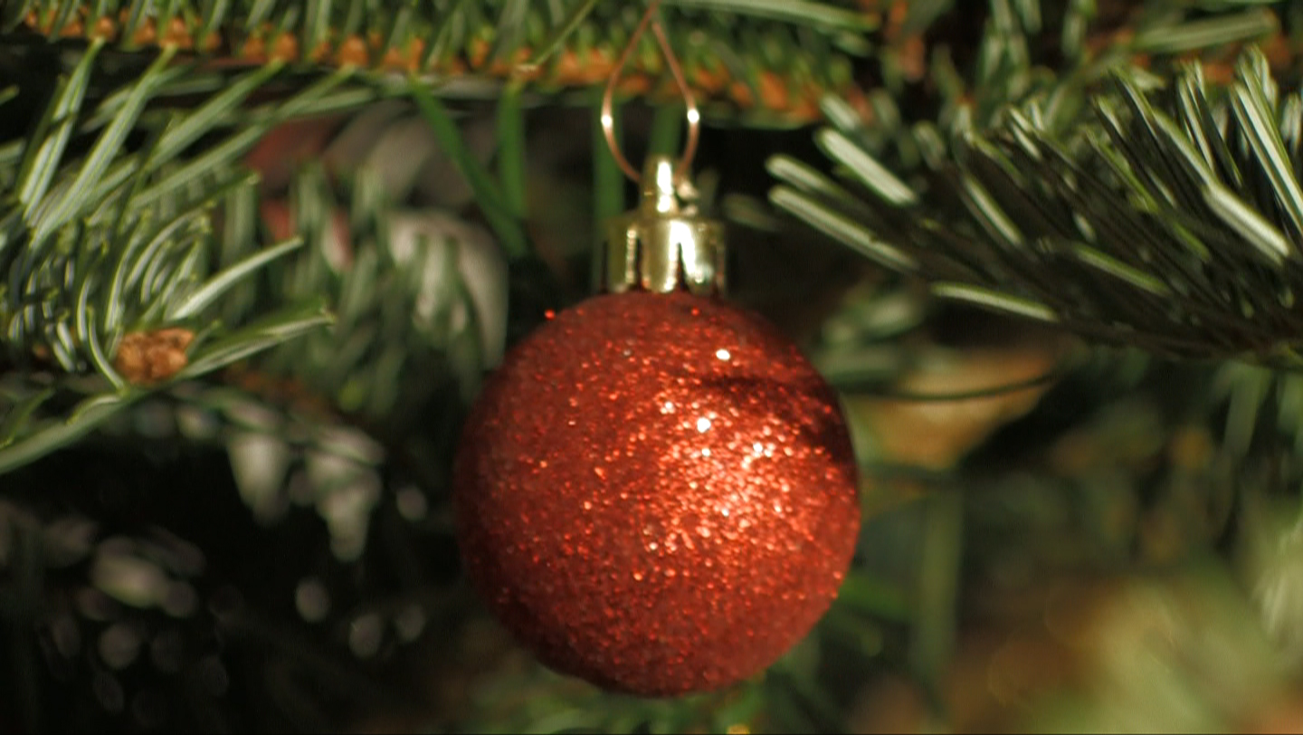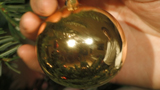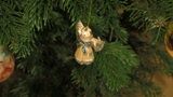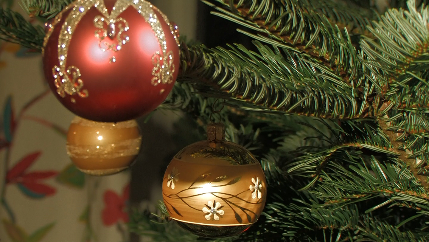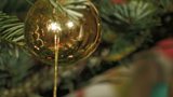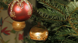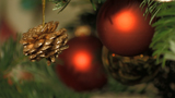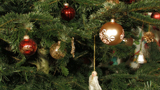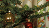 Description: Chrismas tree balls and decoration is hung on a chrismas tree.