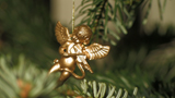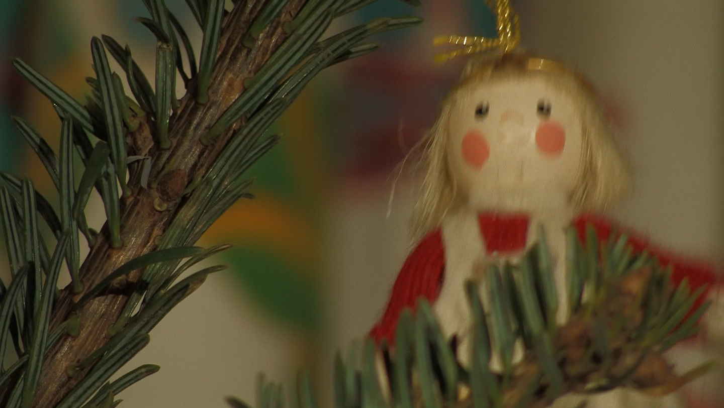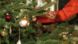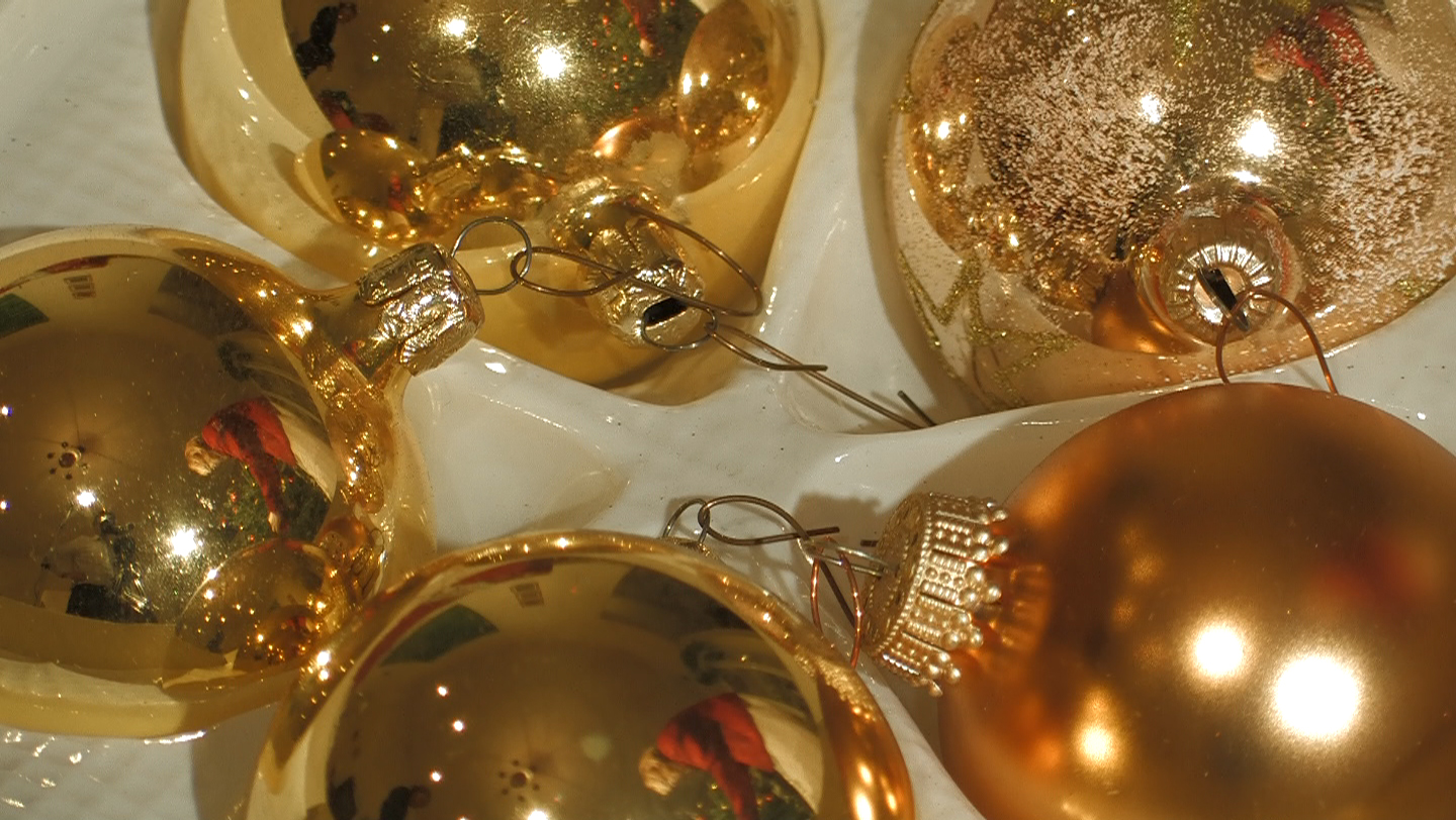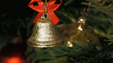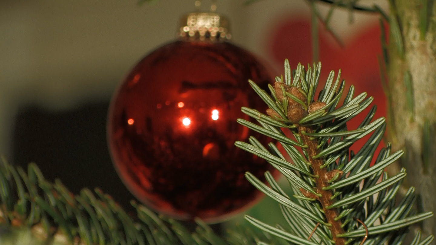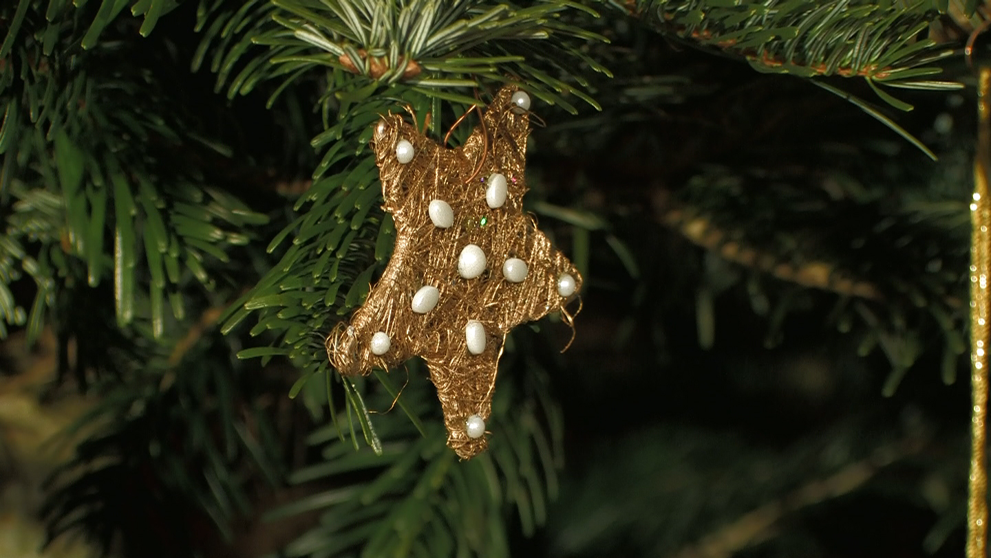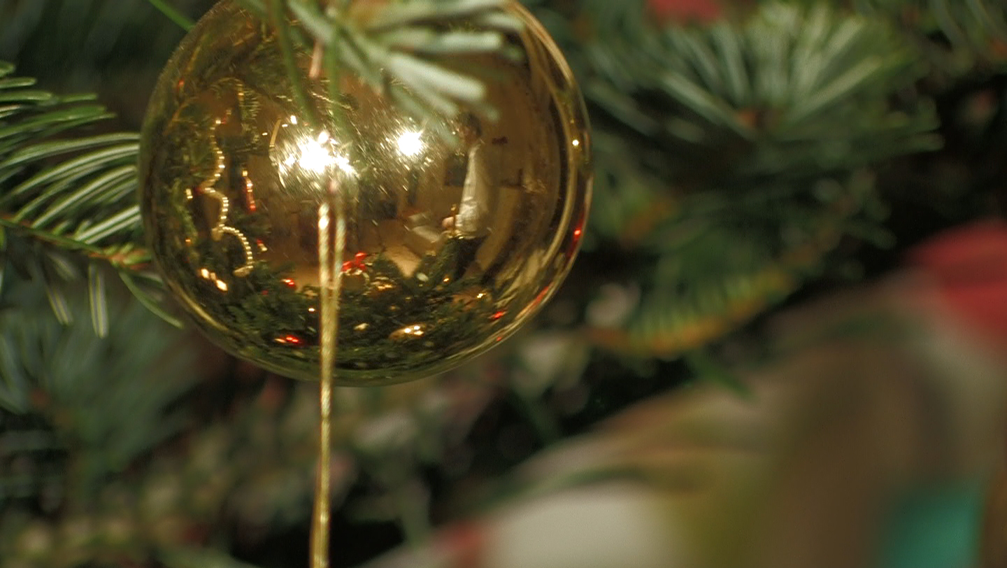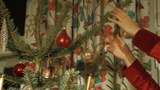 Description: Chrismas tree balls and decoration is hung on a chrismas tree.
