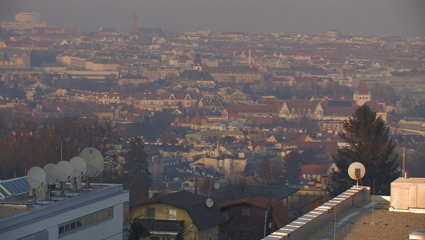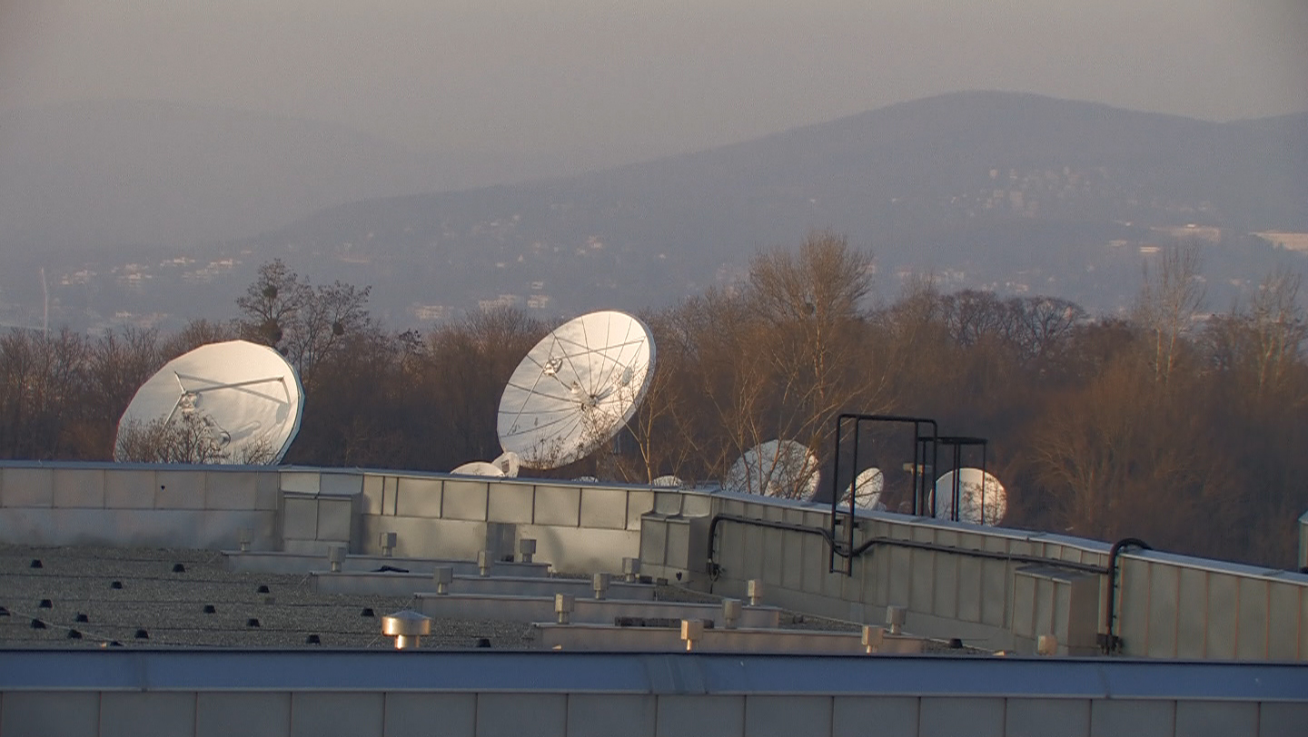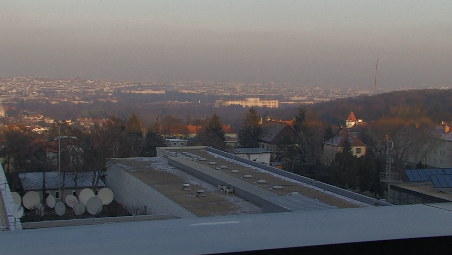 Description: You can see the castle Schönbrunn and the flat roofs of the Austrian Broadcasting Cooperation center (ORF). There are several satelite dishes on the roof.